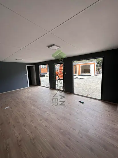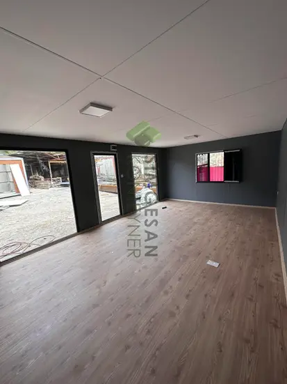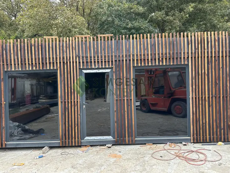 Simgesan 4x8 ofis konteyneri, modern tasarımı, geniş iç hacmi ve fonksiyonel yapısıyla iş yerleri için ideal bir taşınabilir ofis çözümüdür. İki odalı, mutfak ve banyolu tasarımıyla uzun süreli kullanıma uygundur. 8mm betopan dış kaplama, ahşap pergole detayları ve çelik karkas taşıyıcı sistem sayesinde dayanıklılık ve estetiği bir arada sunar.